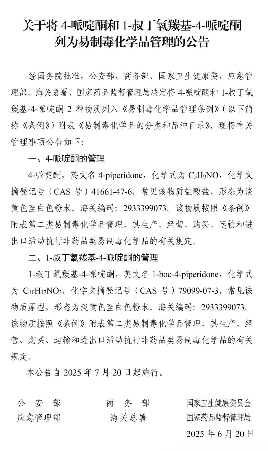 為嚴格易制毒化學(xué)品管理,嚴防流失用于制毒,經(jīng)國務(wù)院批準,公安部、商務(wù)部、衛(wèi)生健康委、應(yīng)急管理部、海關(guān)總署、國家藥監(jiān)局于2025年6月20日聯(lián)合發(fā)布公告,將4-哌啶酮和1-叔丁氧羰基-4-哌啶酮列入《易制毒化學(xué)品管理條例》附表《易制毒化學(xué)品的分類和品種目錄》予以管制,公告自2025年7月20日起施行。